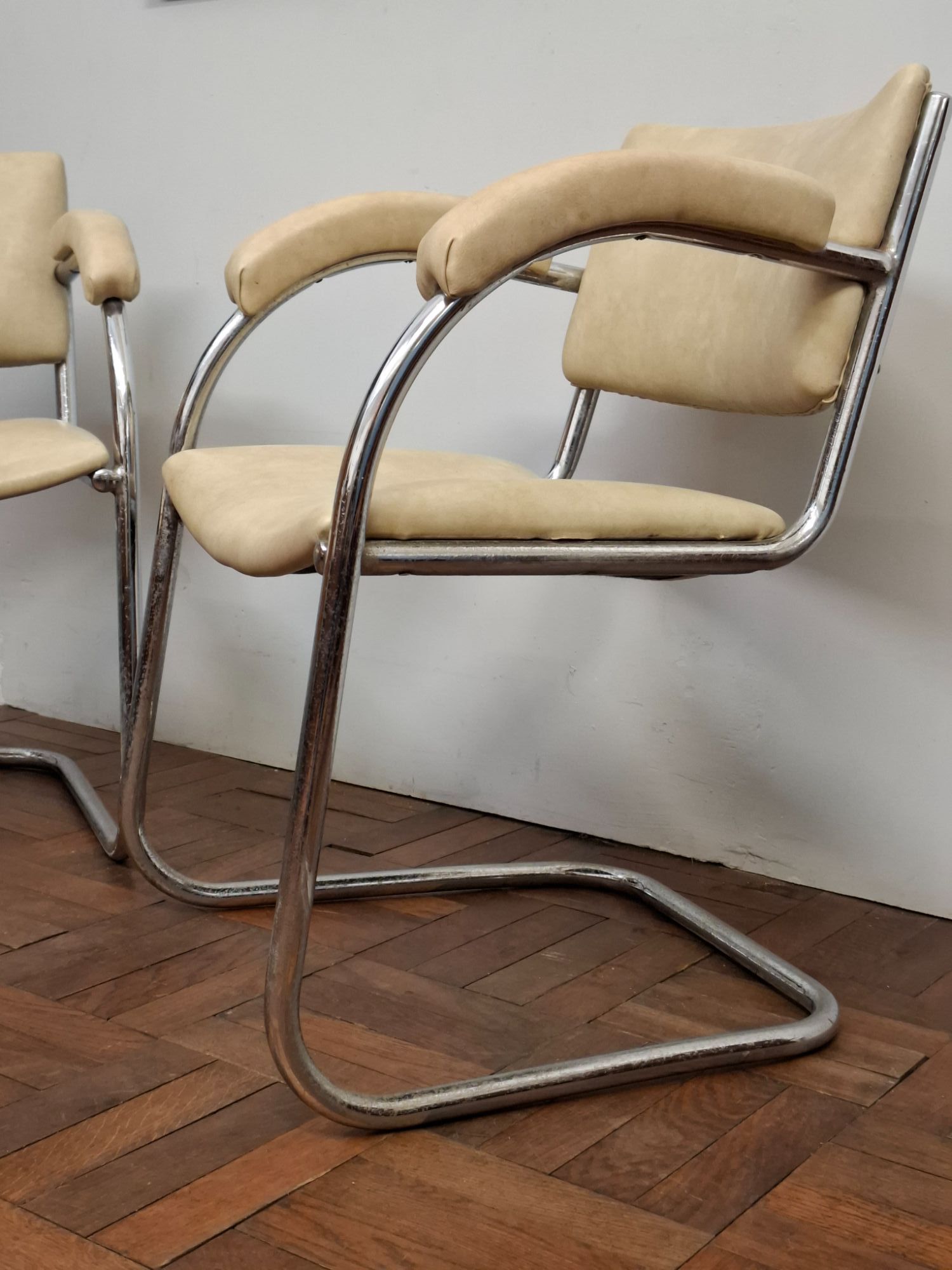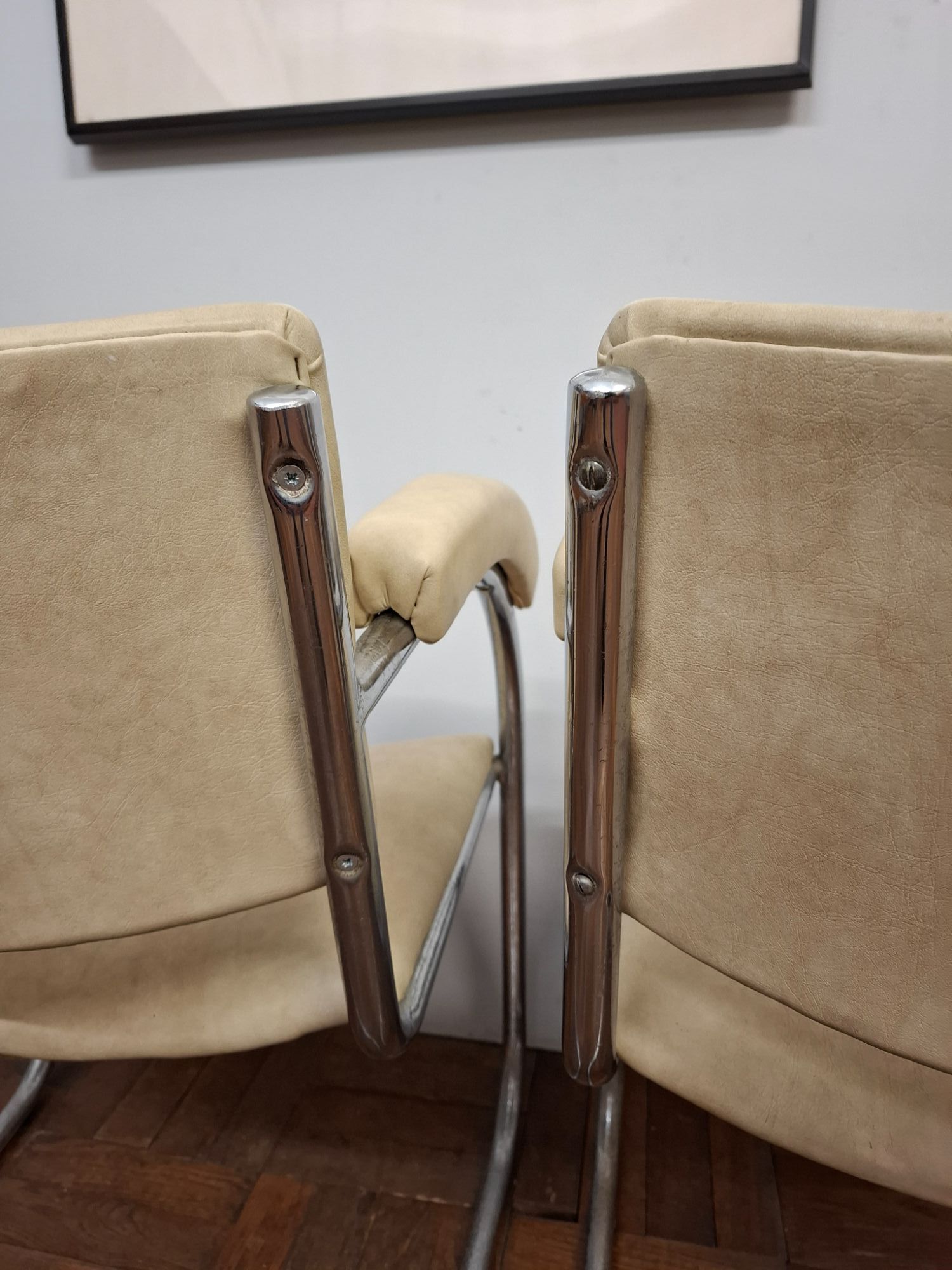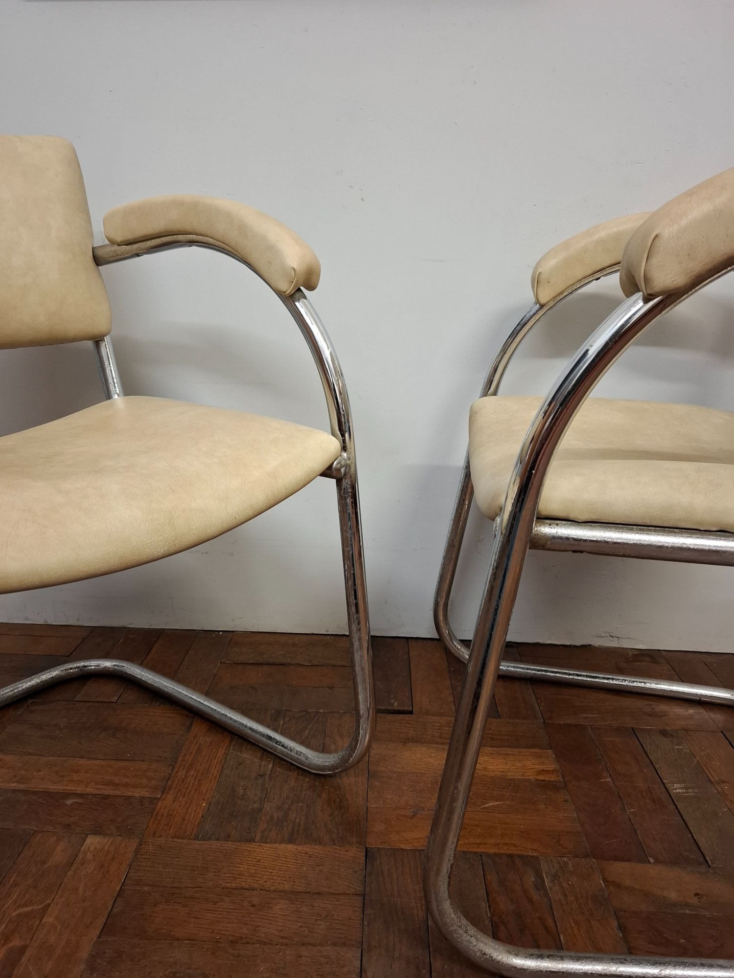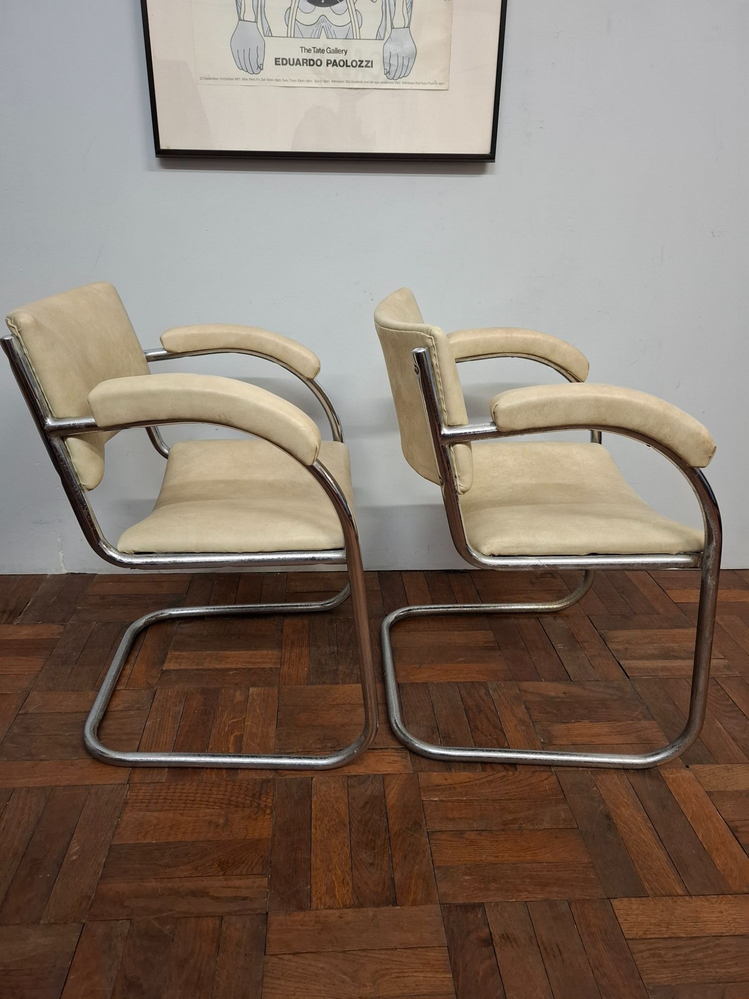 Pair of matching armchairs made by PEL, 1932 -4, England. Model SP9 finished in chrome plated steel and recovered in cream vinyl. Both chairs have their original PEL labels.
