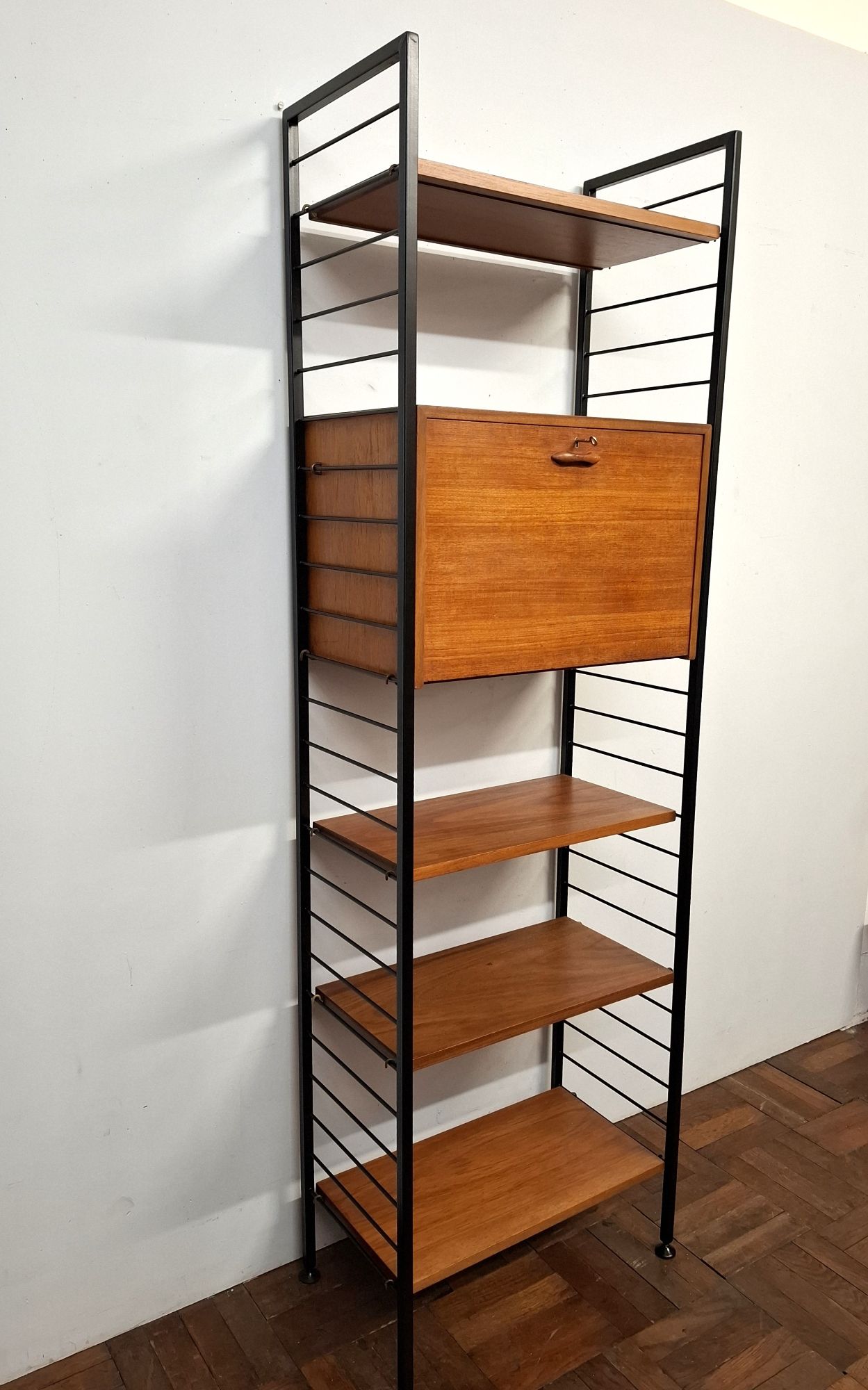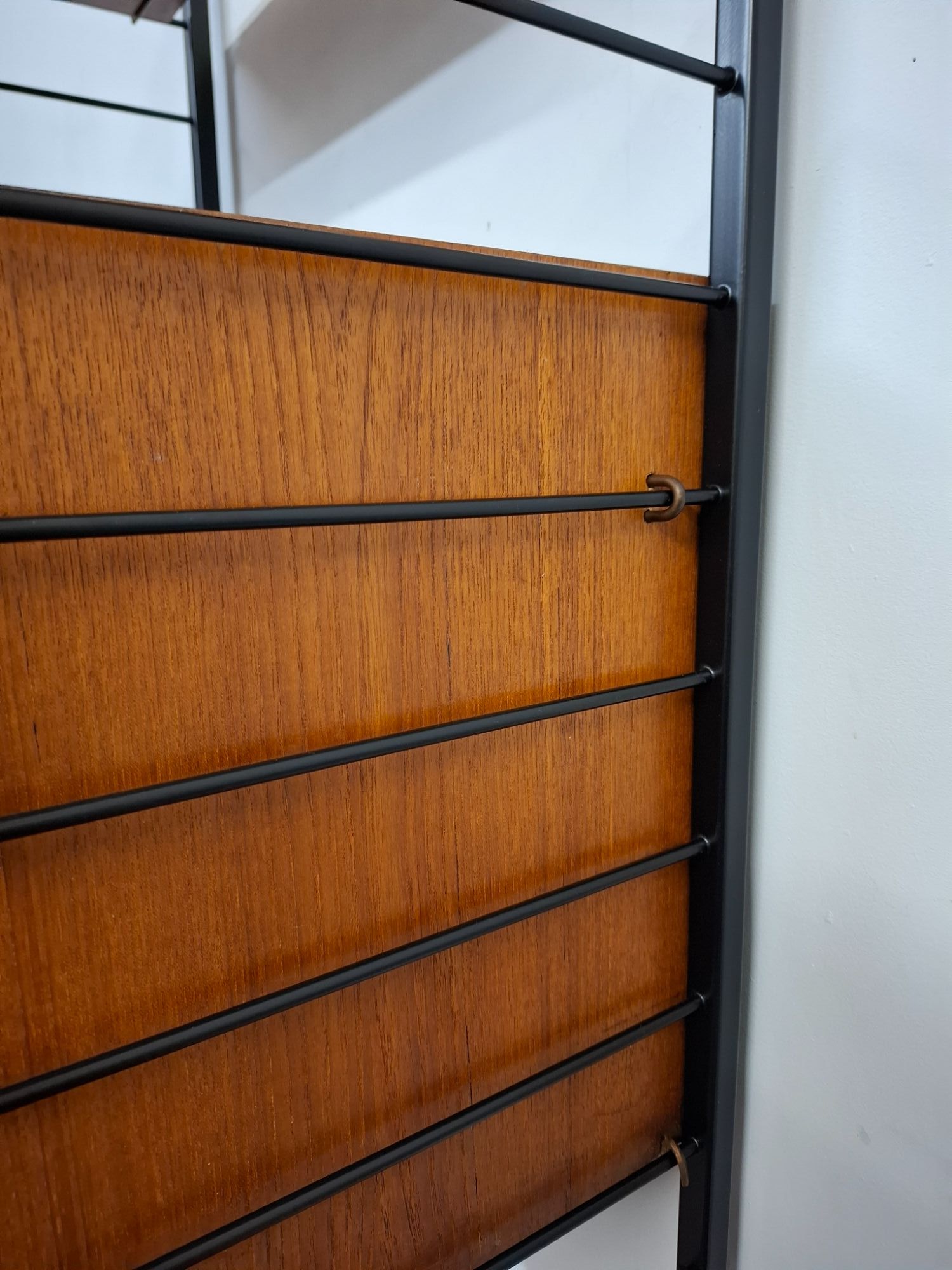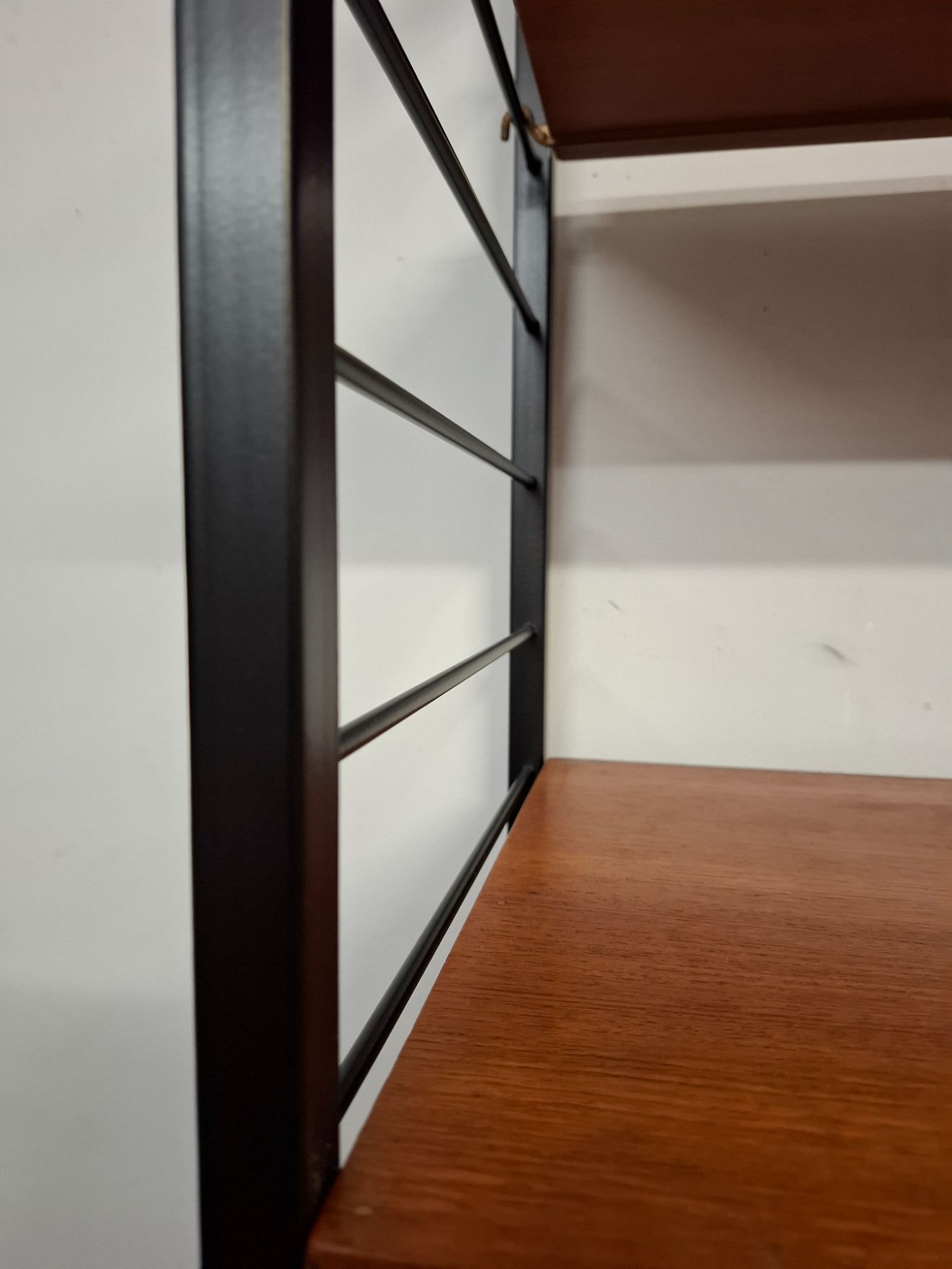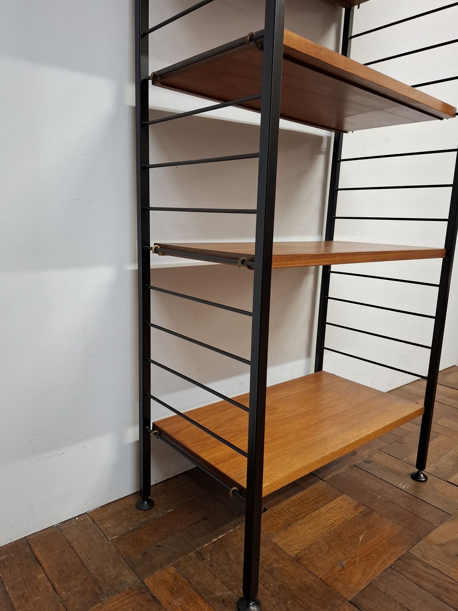 Very flexible, teak veneer and newly black powder coated steel shelving uprights by Staples & Co., London 1960s.This stylish practical product was designed by Robert Heal (of the Heals store family) in the 1960s and manufactured in England.