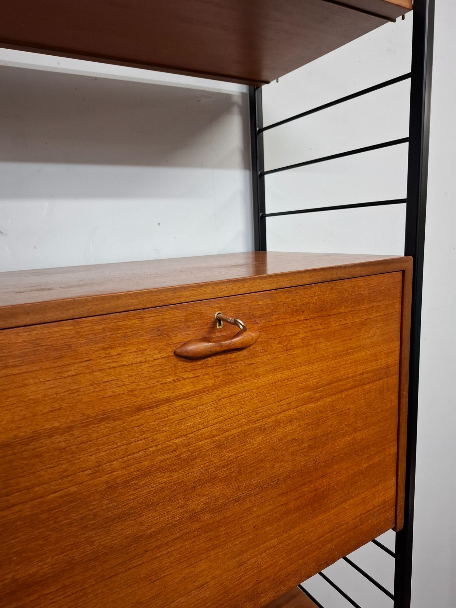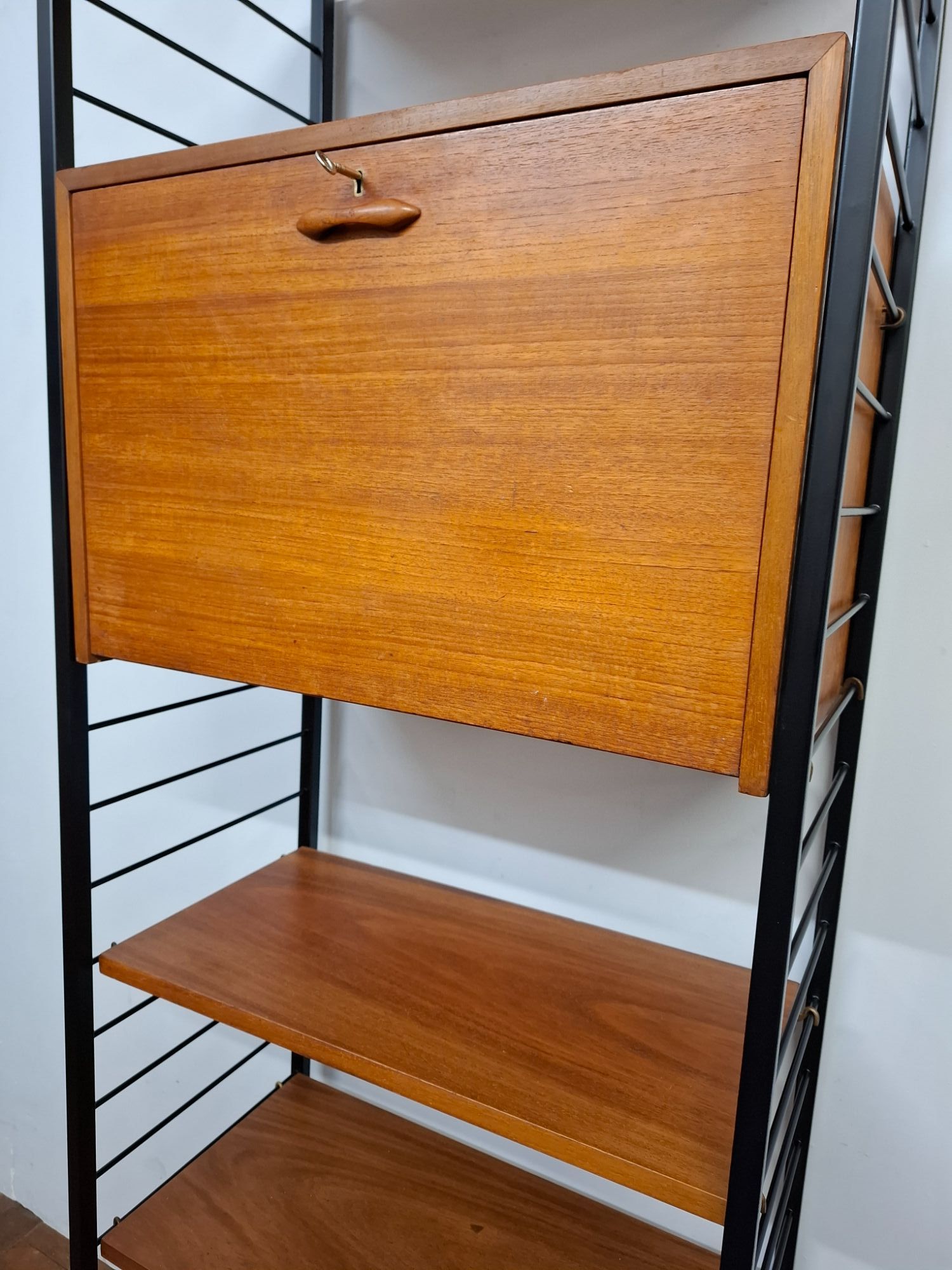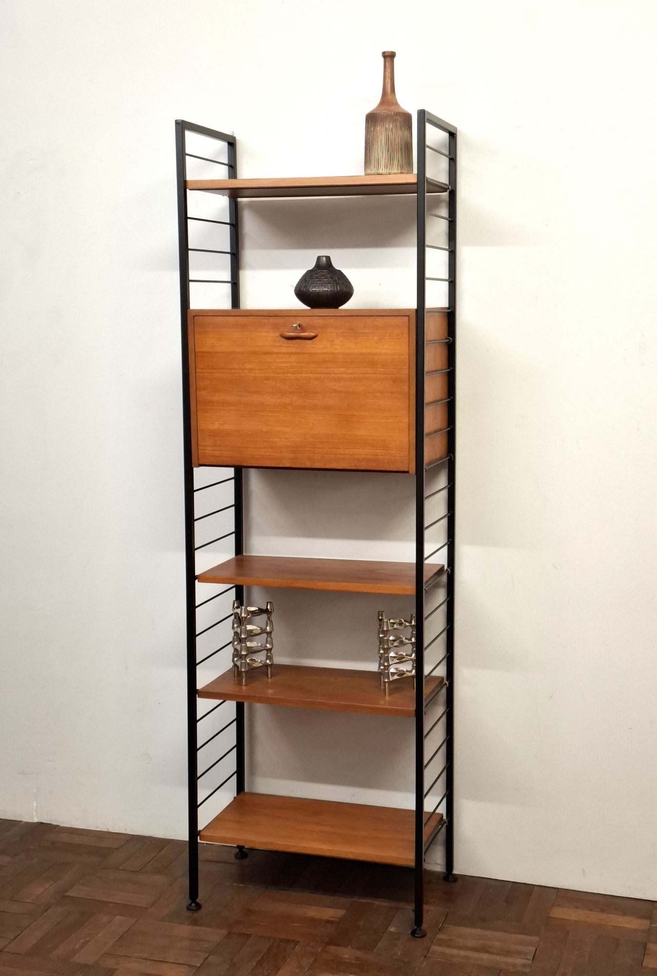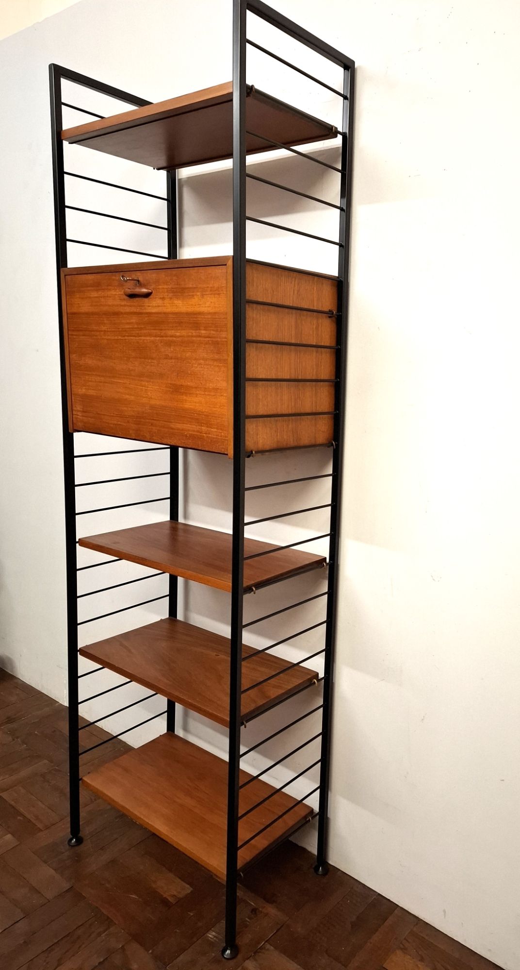 Very flexible, teak veneer and newly black powder coated steel shelving uprights by Staples & Co., London 1960s.This stylish practical product was designed by Robert Heal (of the Heals store family) in the 1960s and manufactured in England.