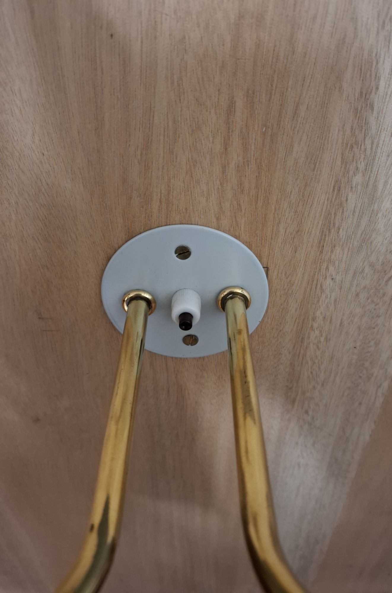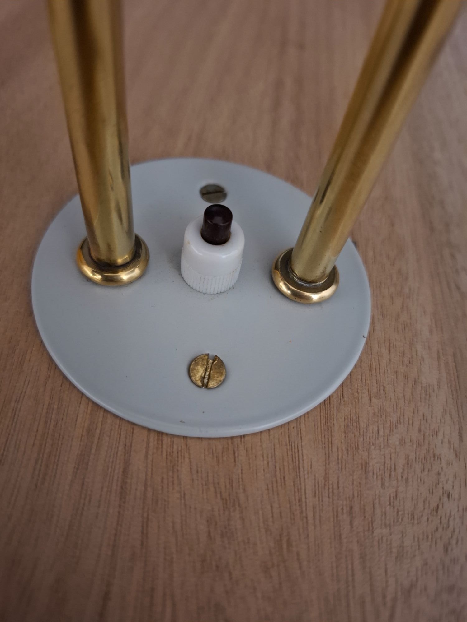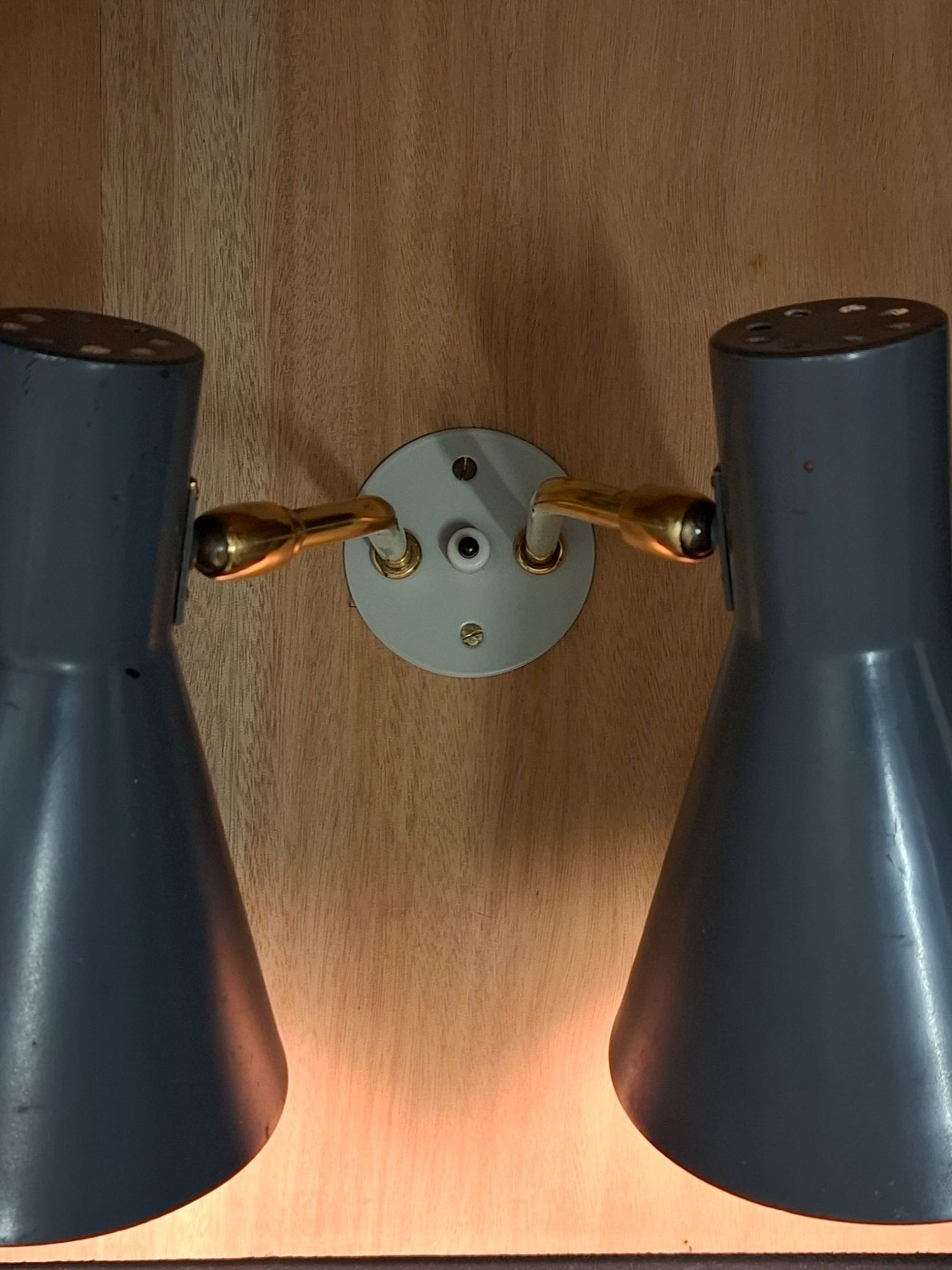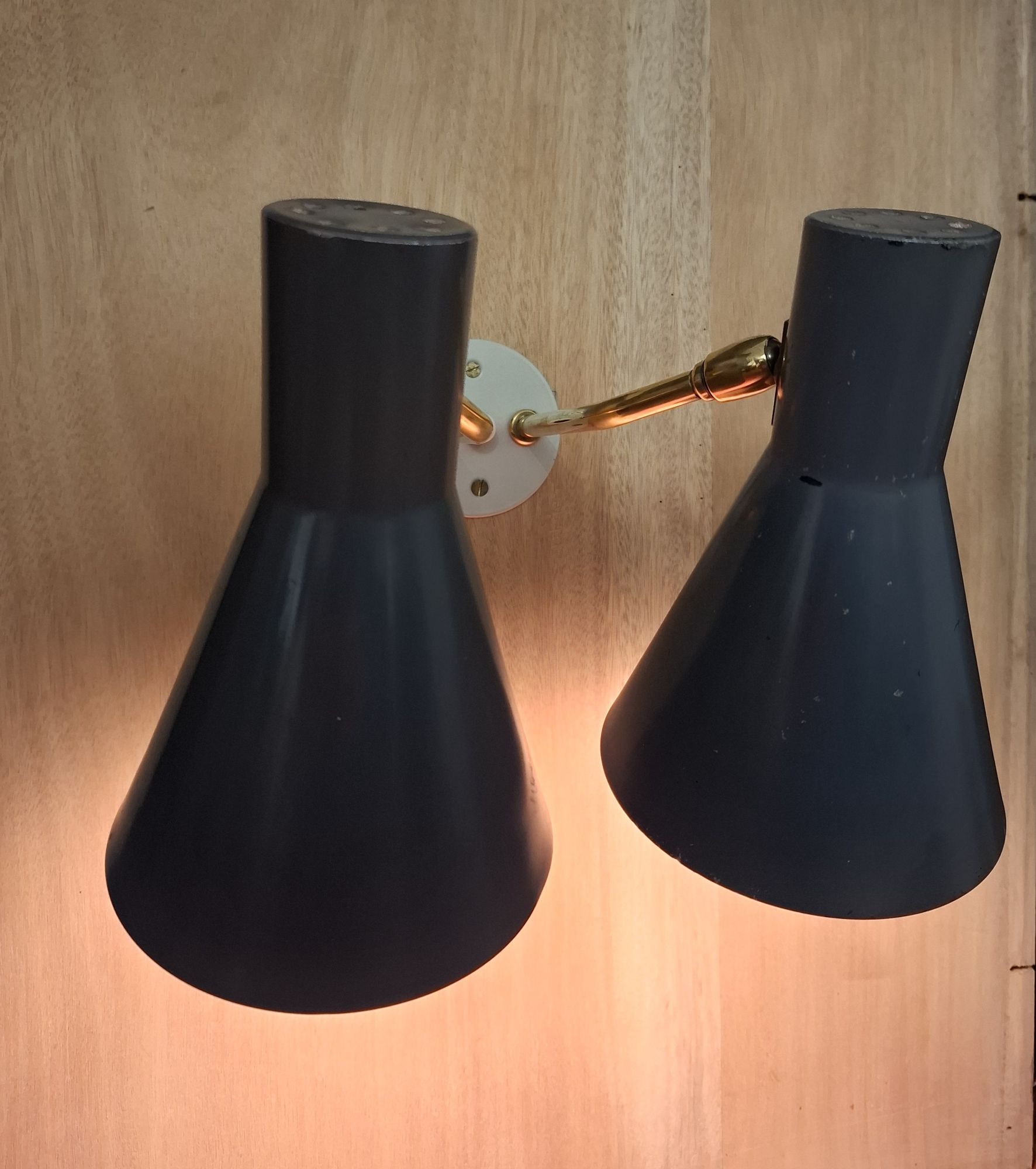 Stylish twin light set in the Italian style. Made c1960 in factory painted alloy shades and solid brass stems with smooth working multi-position fittings. The steel light grey base plate is original and has been re-powder coated. The switch is working well.